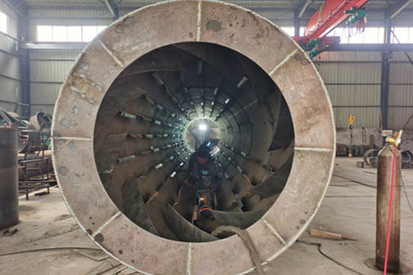 鐵屑通過傳送帶送入烘干機(jī)后,與熱源燃燒產(chǎn)生的熱空氣接觸,此時(shí)冰塊融化或者水分會(huì)逐漸蒸發(fā),由于烘干機(jī)內(nèi)設(shè)置有揚(yáng)料板,會(huì)在筒體轉(zhuǎn)動(dòng)的作用下不斷將鐵屑帶起,所以會(huì)加快水分蒸發(fā)的過程,使鐵屑快速干燥,干燥后的鐵屑從烘干機(jī)尾部落下由輸送帶送至倉庫中,烘干產(chǎn)生的水蒸氣則被引風(fēng)機(jī)抽出烘干機(jī)外排放,由于該機(jī)烘干過程中主要是鐵屑和水分,幾乎不產(chǎn)生其他廢氣,從節(jié)省成本方面考慮,可以不設(shè)置除塵器,除非有嚴(yán)格的要求時(shí),再根據(jù)烘干機(jī)型號(hào)配備相應(yīng)的除塵器。